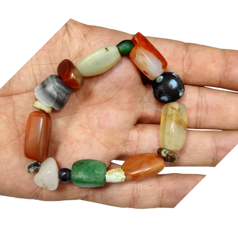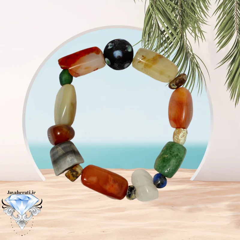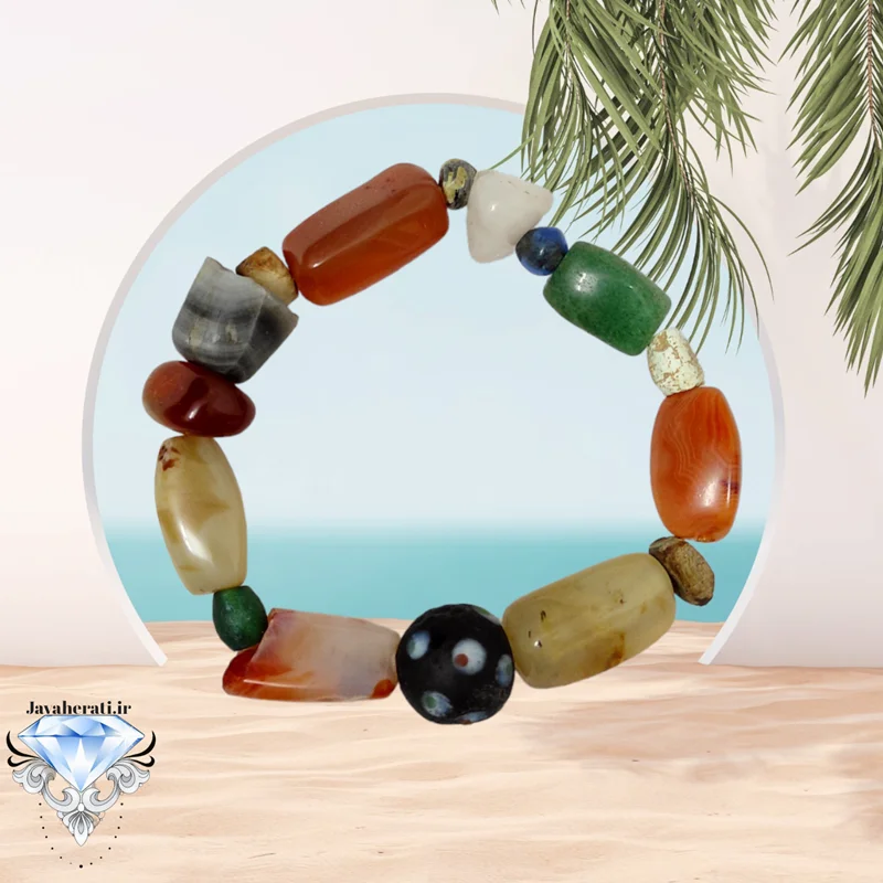 دستبند عقیق یمنی وسلیمانی کهنه تراش دوران صفوی،مهره های گبری ومهره چشم زخم کلکسیونی وارزشمند(ضمانت اصالت) وزن36گرم